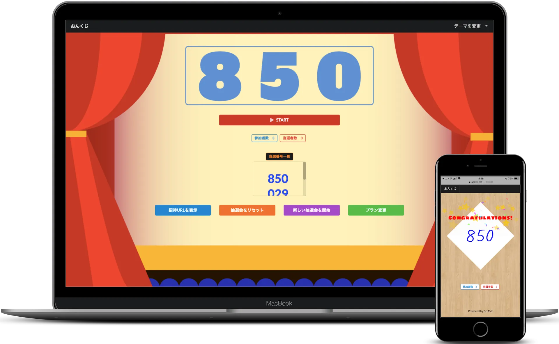 抽選機を回すと、参加者に配られた3桁のくじ番号の中から一つが表示されます。こちらが当選番号になります。当選者には、当選画面が表示されます。